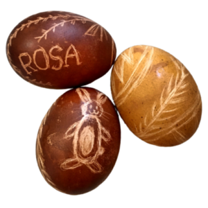These eggs are called “Pisanki” and were decorated by my boyfriend’s dad. The process is as follows: boil eggs, boil water with onion skins, soak hard-boiled eggs in the dye, let them dry, and finally, scratch them with a knife or other sharp object.